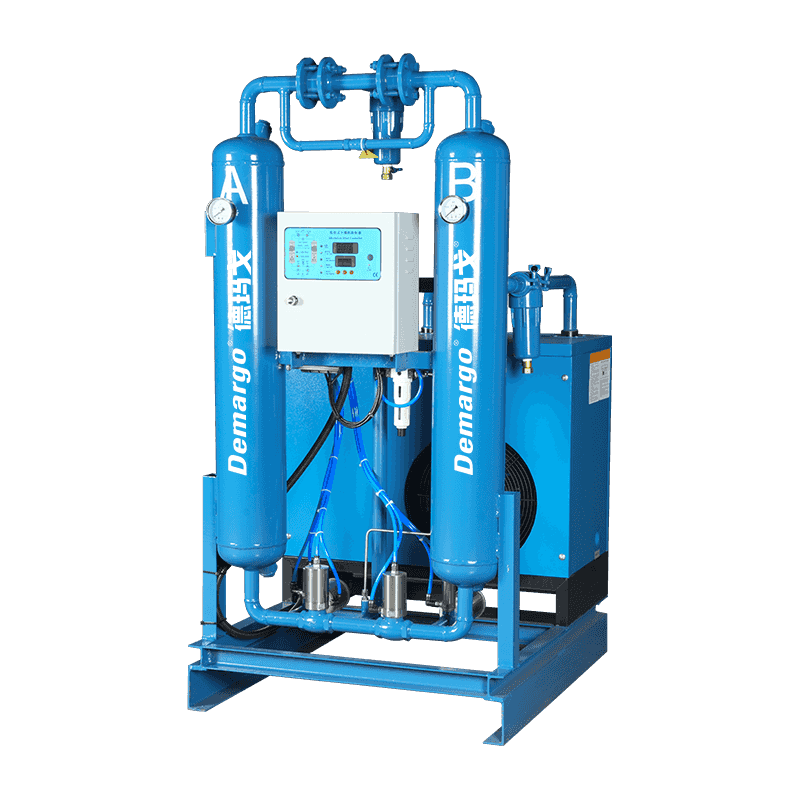 Di dalam mesin gabungan tanpa haba, udara termampat pertama memasuki precooler dalam pengering sejuk untuk bertukar haba dengan udara termampat kering dari pengering, supaya suhu udara termampat kering meningkat, dan pada masa yang sama, suhu udara termampat yang memasuki penyejat dikurangkan, dan sebahagian daripada air dikurangkan ke dalam air. Kemudian ia memasuki penyejat untuk pertukaran haba supaya udara termampat disejukkan ke suhu titik embun kira -kira 5 ° C. Kebanyakan air, minyak, dan beberapa kekotoran di udara termampat dipendekkan di sini, dan udara dan air dipisahkan oleh pemisah air udara, dan kemudian air dan minyak dilepaskan melalui saluran air automatik. Udara termampat kering memasuki pengering melalui penapis penyingkiran minyak, dan selanjutnya menghilangkan air ke suhu titik embun yang memenuhi keperluan. Udara mampat kering yang keluar dari pengering kemudian dikeluarkan oleh penapis penyingkiran habuk untuk mengeluarkan sedikit habuk yang dihasilkan oleh pengering, dan kembali ke precooler di dalam pengering sejuk untuk menyejukkan udara panas dan lembap, supaya suhu sendiri dapat ditingkatkan, yang juga bermanfaat untuk regenerasi pengering. Pada masa yang sama, udara termampat kering yang dipanaskan juga boleh menghalang pemeluwapan daripada berlaku dalam saluran paip yang menyampaikan.