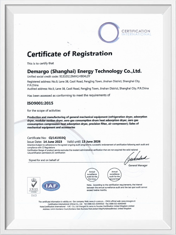 DeMargo (Shanghai) Tenaga Saving Technology Co., Ltd. telah meluluskan pelbagai pensijilan dengan teknologi profesionalnya dan pengalaman yang kaya dalam bidang pemurnian udara termampat. Ia mempunyai pelbagai spesifikasi dan jenis produk. Ia boleh menyediakan pengguna dengan penyelesaian penapisan udara termampat yang disesuaikan mengikut ciri-ciri pemampat udara yang berbeza untuk memastikan pengguna memperoleh udara termampat berkualiti tinggi. Pada masa yang sama, ia menyediakan perkhidmatan pra-jualan yang komprehensif dan selepas jualan untuk memastikan operasi stabil sistem.