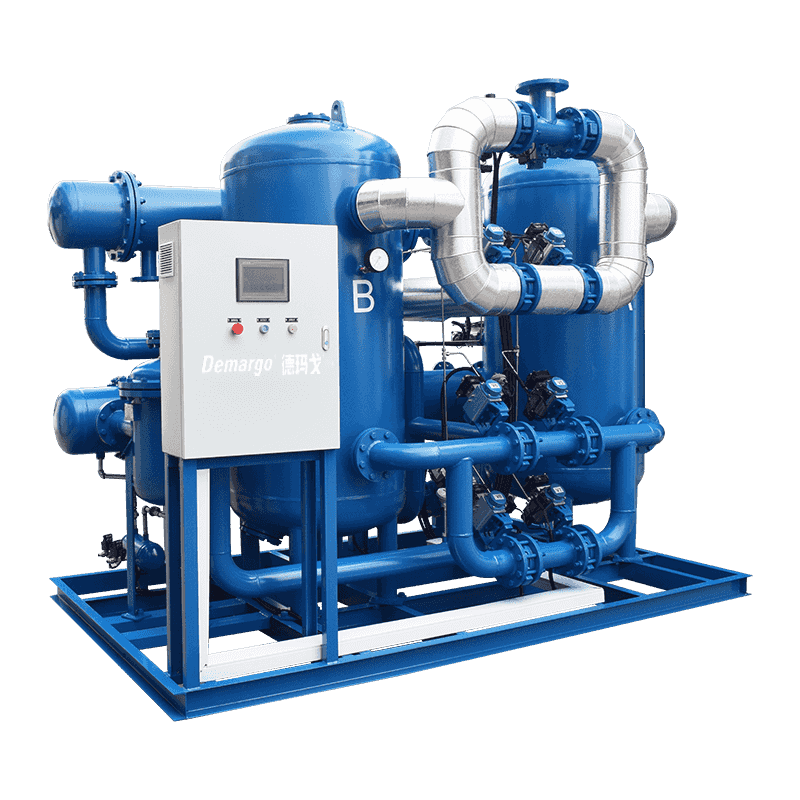 Pengering haba sisa menggunakan haba sisa pemampat udara bebas minyak untuk memanaskan dan menjana semula penjerap; Ia memanfaatkan sepenuhnya haba sisa dalam sistem udara termampat. Tanpa menggunakan peranti pemanasan, kesan pengering pemanasan juga dapat dicapai, menunjukkan sepenuhnya ciri penjimatan tenaga dan kecekapan tinggi. Titik embun gas siap boleh mencapai -40 ℃. Pengawal PLC yang dibangunkan sendiri digunakan, yang lebih stabil dan boleh dipercayai daripada mikrokomputer tunggal-cip. Injap kawalan menggunakan injap kupu-kupu berkualiti tinggi untuk memastikan beralih bebas masalah lebih daripada 1 juta kali. Reka bentuk penyelewengan lanjutan membolehkan udara termampat untuk menghubungi penjerap secara merata, sepenuhnya menghapuskan fenomena penyaluran.